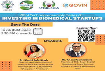 Avishkaran NIPER Hyderabad organized 2nd GEM Technopreneurship talk on 'Investing in Biomedical Startups'
